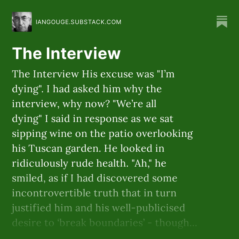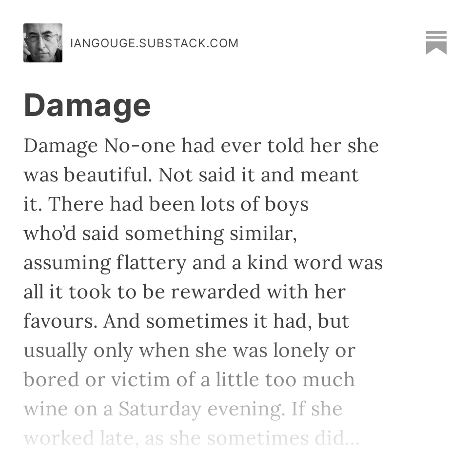 Digest of this week’s Substack activity Ian Gouge Blog, Books, Fiction, Literature, Poetry, Short Stories, Uncategorized, Writing October 27, 2023 1 Minute Here is a summary of my activity on Substack this week. Click on any of the images to be taken to the post concerned. Free Preview Free Preview FREE FREE Free Preview FREE If you liked this content, please share it! Click to share on WhatsApp (Opens in new window) WhatsApp Click to share on Facebook (Opens in new window) Facebook Click to share on X (Opens in new window) X Click to share on Reddit (Opens in new window) Reddit Click to share on LinkedIn (Opens in new window) LinkedIn Click to share on Pinterest (Opens in new window) Pinterest Click to share on Tumblr (Opens in new window) Tumblr Like Loading... Published October 27, 2023